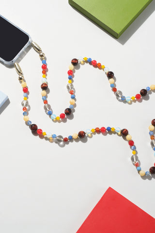 ** WILL CONTACT FOR CASE SIZE Painted and polished natural wood beads, woven together with braided cord. Long, crossbody style. Length: 43" Ball chain connection feature is designed for use with our custom phone case. All ossa products...Read more